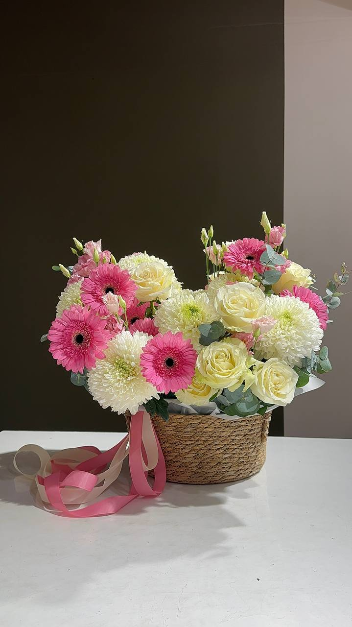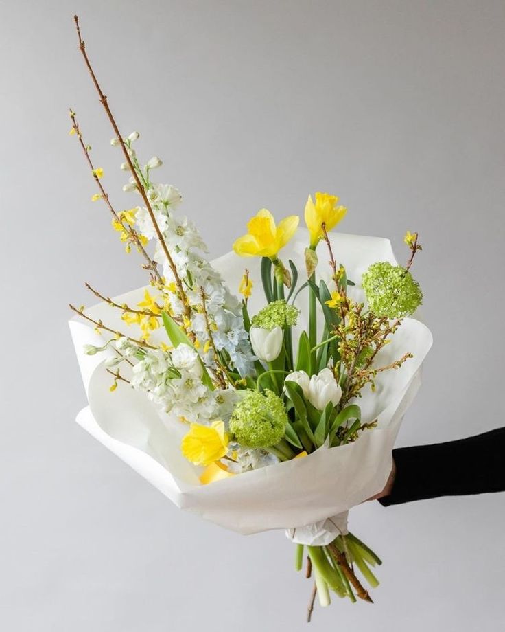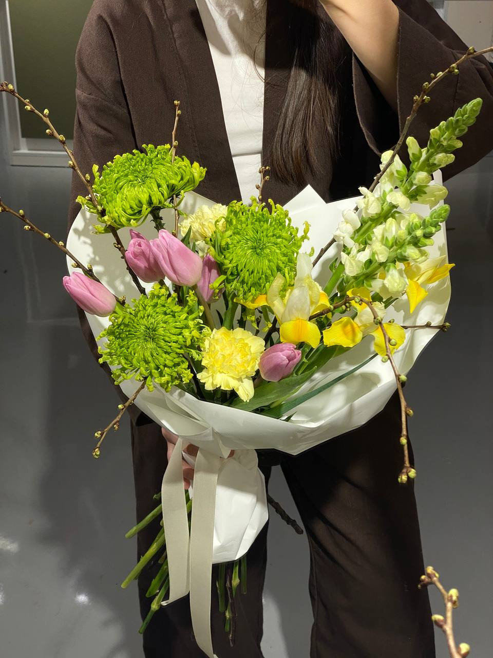 Состав: хризантема одноголовая, антирринум, тюльпан, цветущие ветви, диантус, ирис,диантус